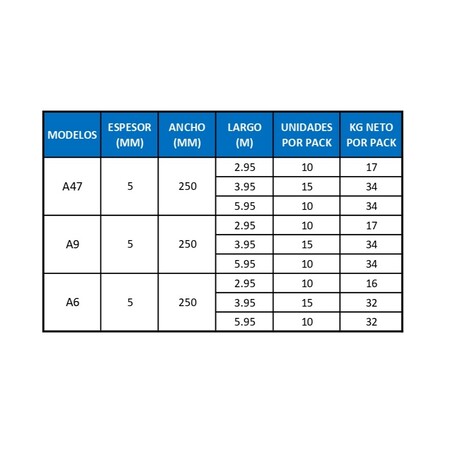Dimensiones: 200 x 7 mm x 4, 5 y 6 mts.